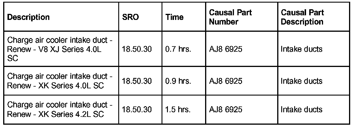 Some XKR and XJR vehicles within the above VIN range may experience a loss of performance due to the intake ducts not fitting securely. Revised ducts and clamp plates are now available to solve this complaint.