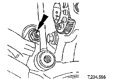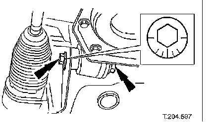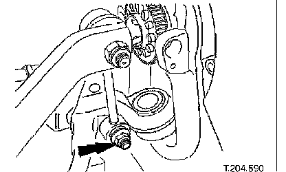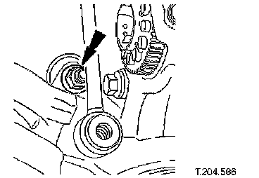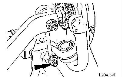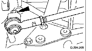 ^ Carefully move steering rack downwards for access to wishbone eccentric bolt.