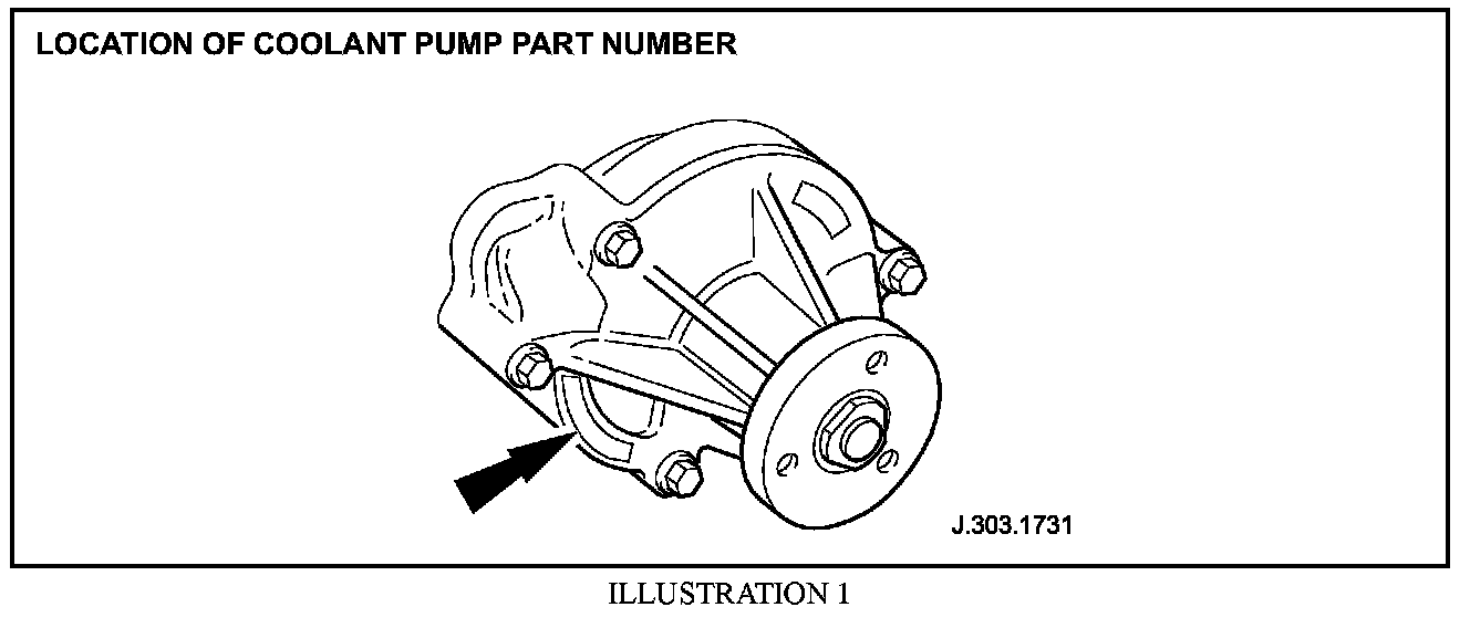 2. Check coolant pump part number. If any of the part numbers are as follows, 96JV-8501-CA, CB, CC or CD, replace the coolant pump. (Illustration 1).