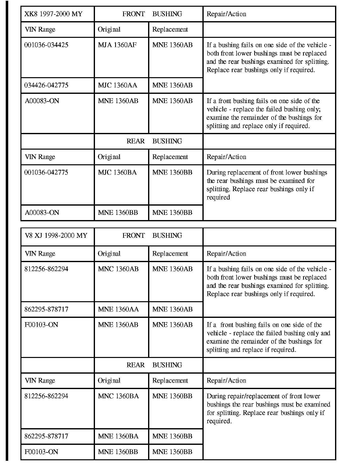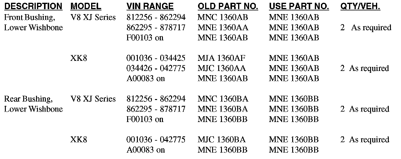 The design of the bushings in the front suspension lower *wishbones* on the above vehicles *was* changed, requiring a change in the procedure for replacing the bushings. The change also requires the use of different Special Tools. Since replacement bushing for earlier vehicles have been superseded to the latest condition, *the revised procedure also applies to earlier vehicles*.