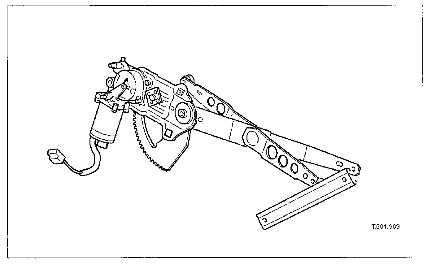 The 5 mm tempered and tinted door glass forms part of a fully framed electrically operated system. A switchpack installed in each door casing provides control of lowering and raising of that particular door glass with additional 'one-shot' fast lowering . The driver's door switchpack also provides for independent control of each passenger door glass and total isolation of all passenger door glass control. Each door glass is raised and lowered by an electrically operated scissor mechanism. All door glass can only be operated when the ignition switch is in position I or II.