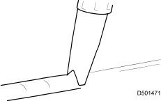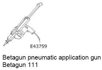 7. Using the special tool, apply a uniform bead of adhesive to the rear quarter window glass edge commencing at the bottom center and overlapping the ends approximately 14 mm (0.56 in).