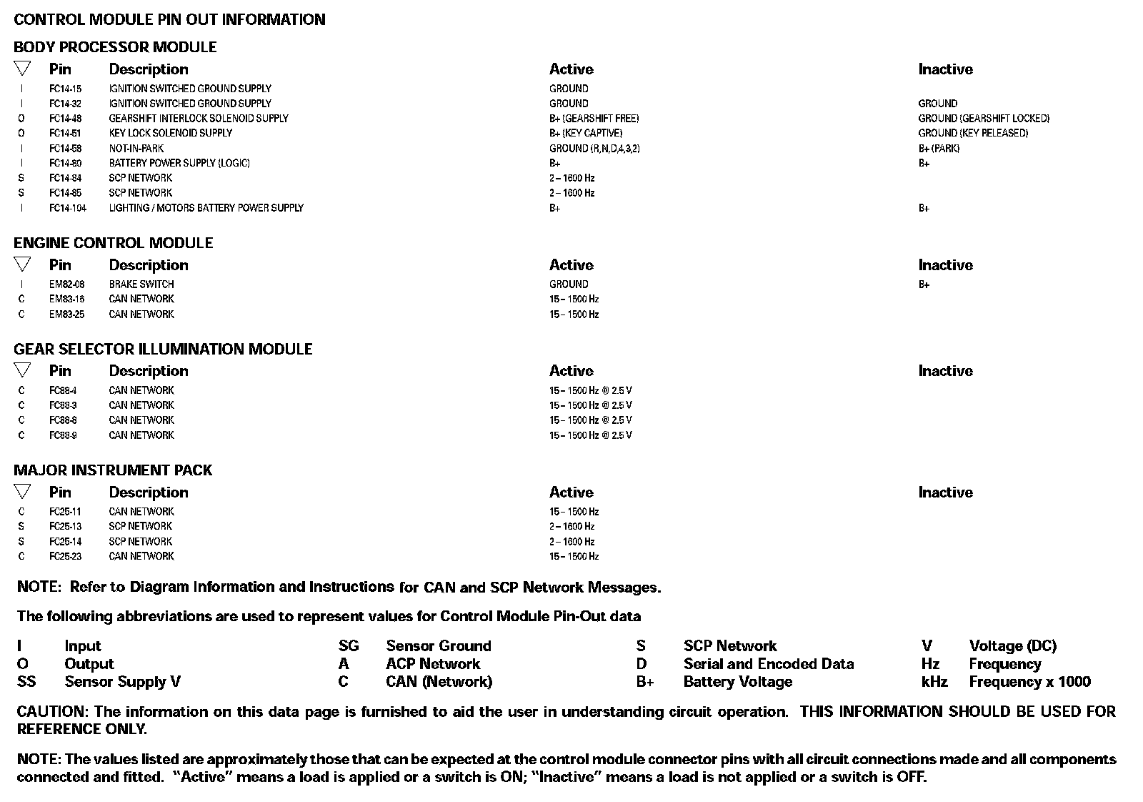 Control Module Pin Out Information: