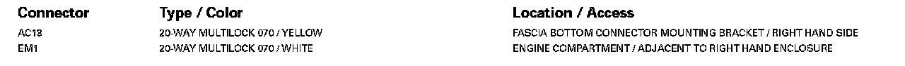 For detailed informations and illustrations regarding the location and identification of control modules pins, refer to Vehicle / Diagrams / Connector Views. Connector Views