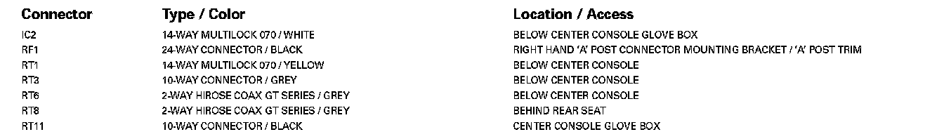 For detailed informations and illustrations regarding the location and identification of control modules pins, refer to Vehicle / Diagrams / Connector Views. Connector Views