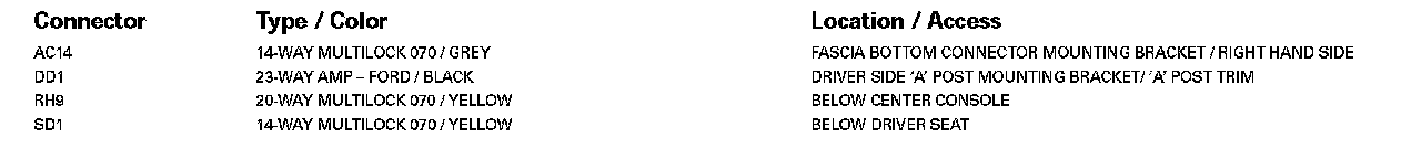 For detailed informations and illustrations regarding the location and identification of control modules pins, refer to Vehicle / Diagrams / Connector Views. Connector Views