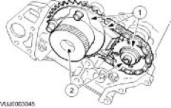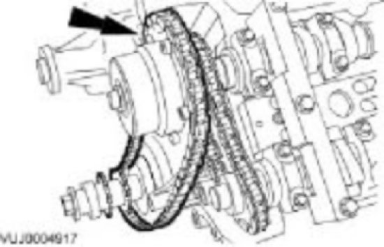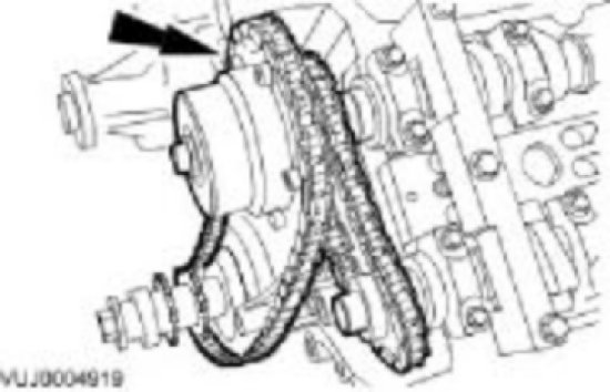 Fit the assembly to the camshafts with the chain correctly positioned over the tensioner; variable camshaft timing oil control unit (or intake camshaft sprocket - vehicles fitted with supercharger) to the inlet and the sprocket to the exhaust.