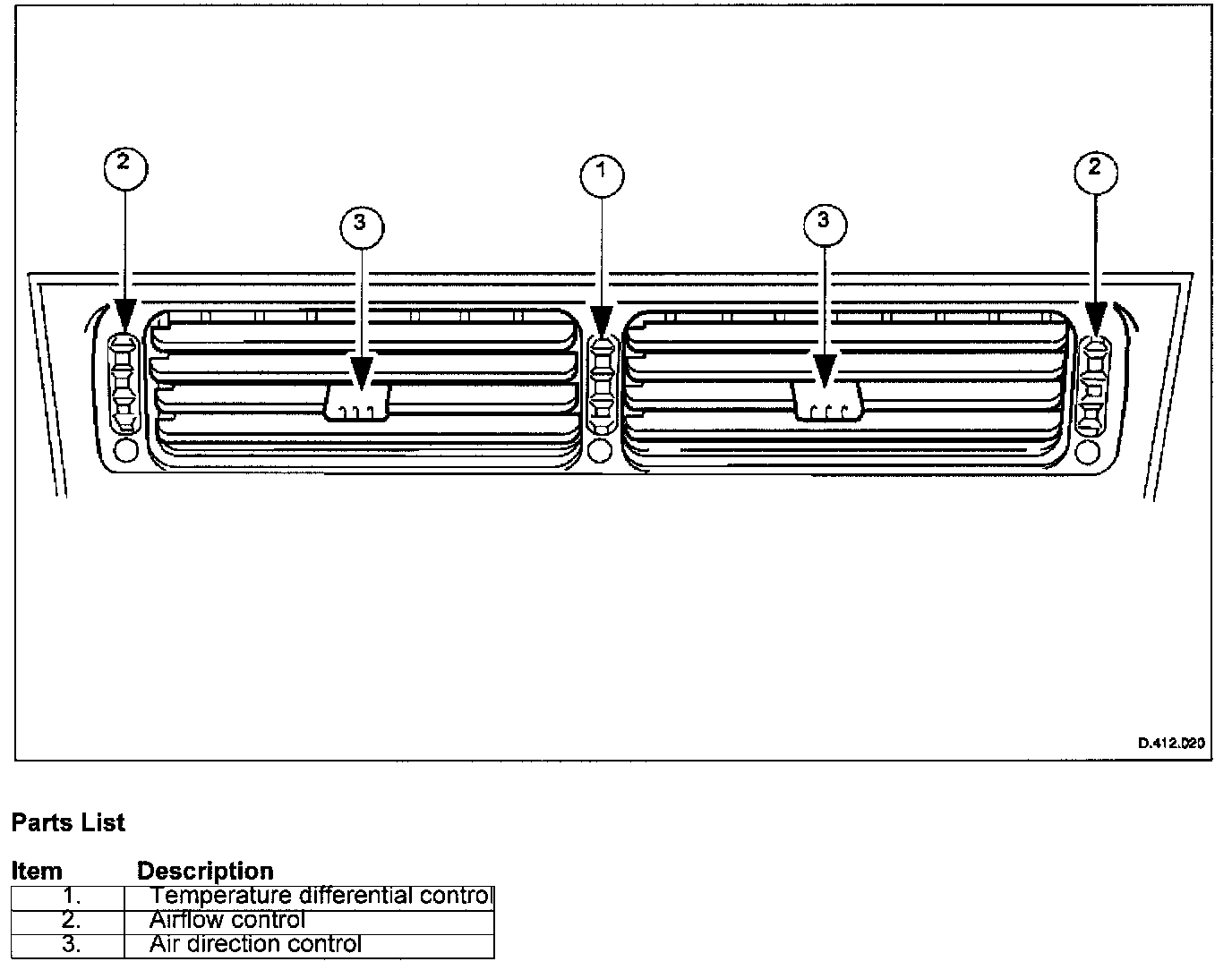 Only the center face air vent assembly incorporates the three listed controls; the EOD vents, not shown, only feature items 2 and 3.