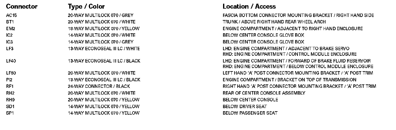 For detailed informations and illustrations regarding the location and identification of control modules pins, refer to Vehicle / Diagrams / Connector Views. Connector Views