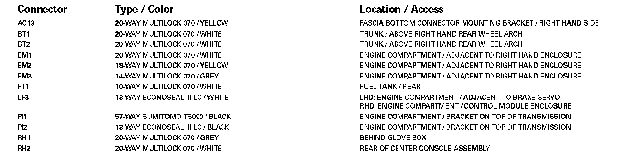 For detailed informations and illustrations regarding the location and identification of control modules pins, refer to Vehicle / Diagrams / Connector Views. Connector Views