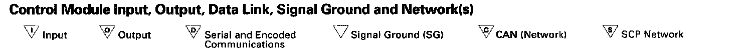 These six symbols are employed to assist the user in visualizing the 'logic' of circuits containing control modules. The symbols identify control module input, output, data link, signal ground and network pins. These symbols are also employed on the corresponding data page.