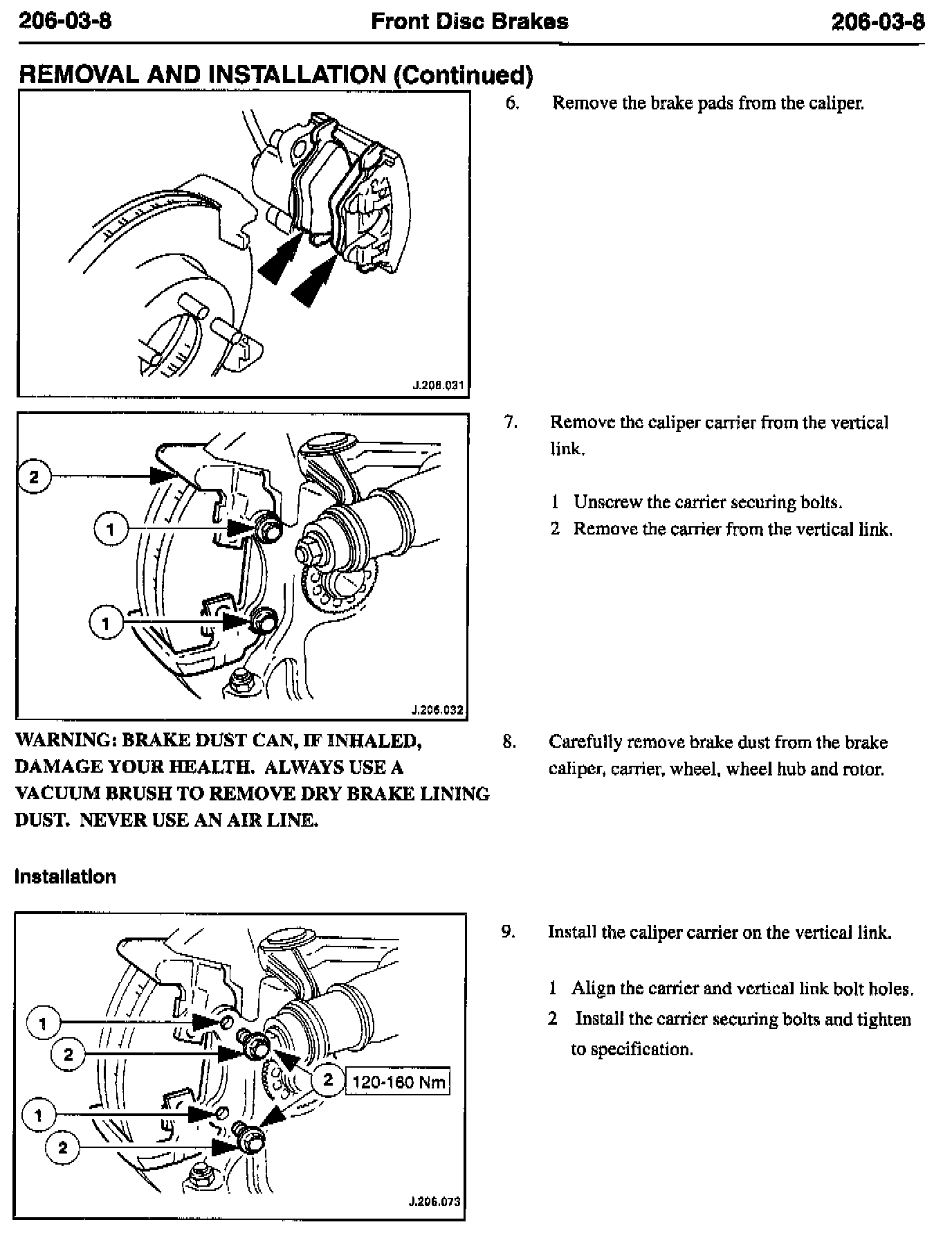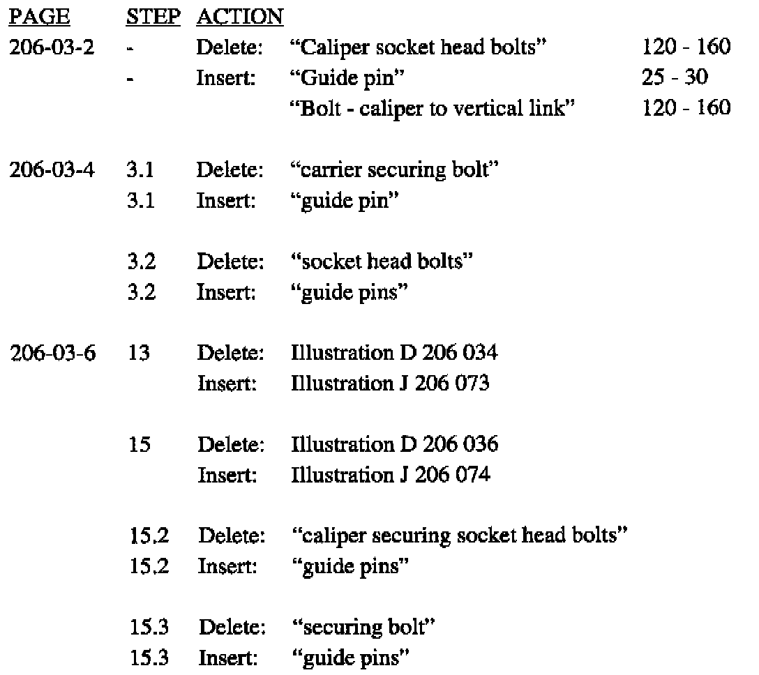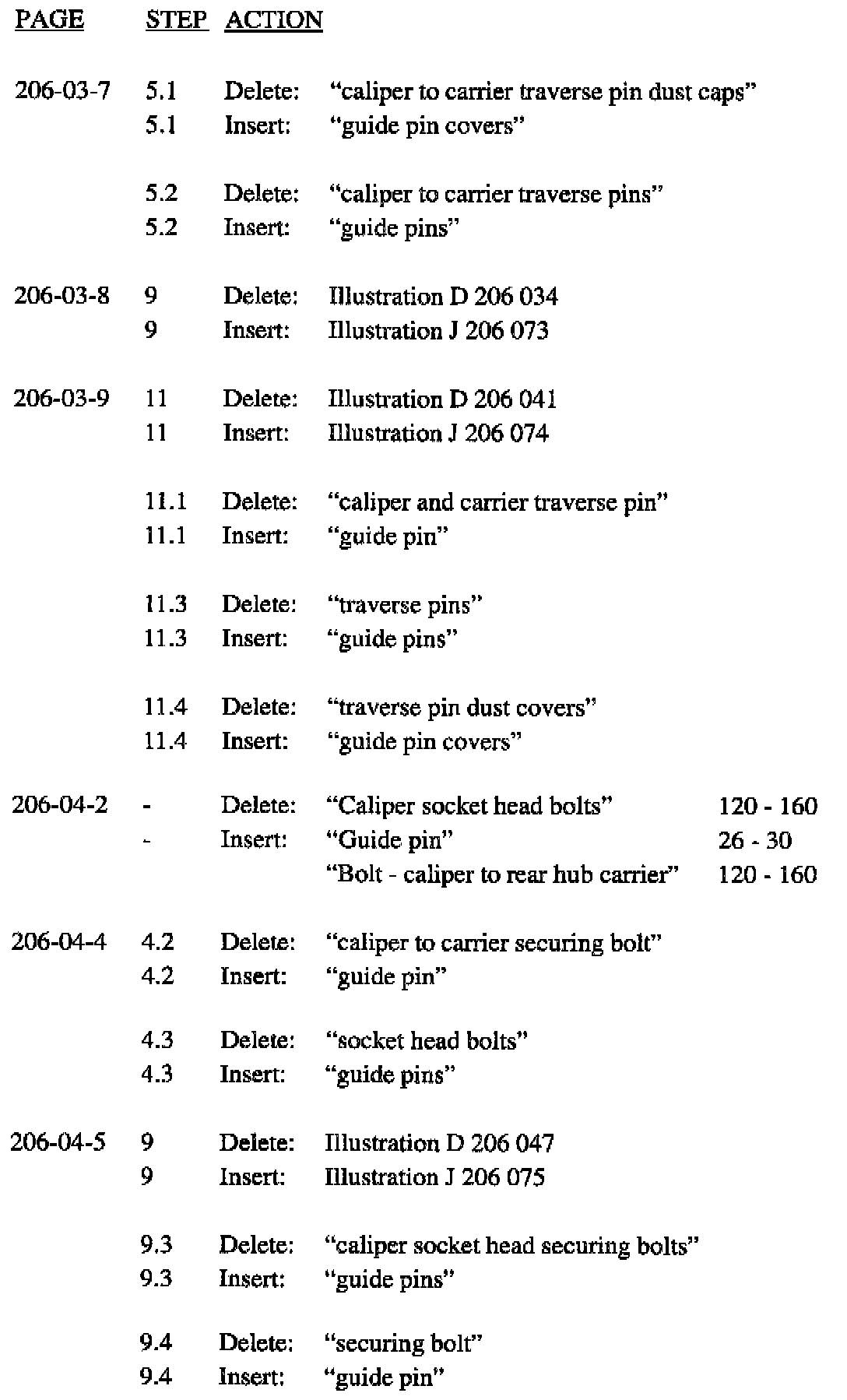 The torque specifications for the caliper carrier retaining bolts and the guide pins are incorrect in the XK8 Vehicle Service Manual (VSM), Section 206, dated 08-96.