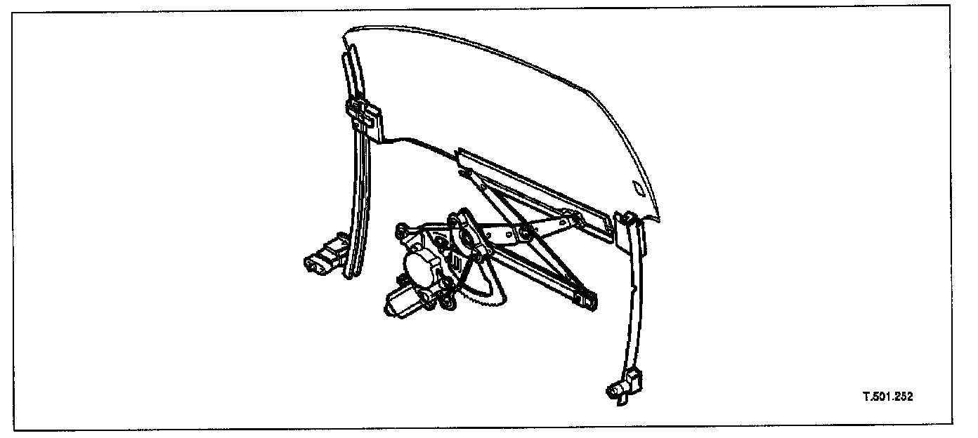 The door glass on both models is a frameless system with 5 mm green tempered glass. The window glass is operated electrically and raised and lowered by a scissor mechanism.