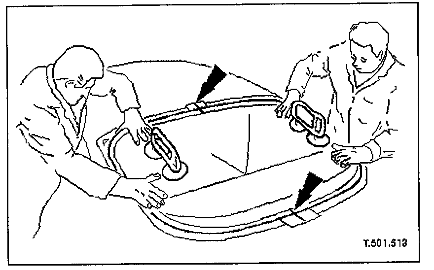 16. Fit lifting handles to glass and with assistance, carefully remove backlight from vehicle and place on clean cloth on bench.