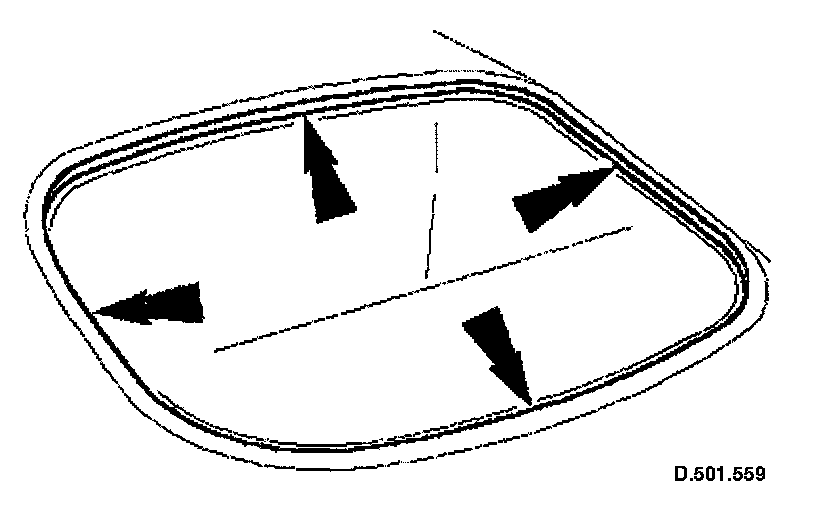 7. Using a pneumatic gun, apply a uniform bead of sealant to the glass edge, commencing at bottom center and overlapping the ends approximately 100 mm.