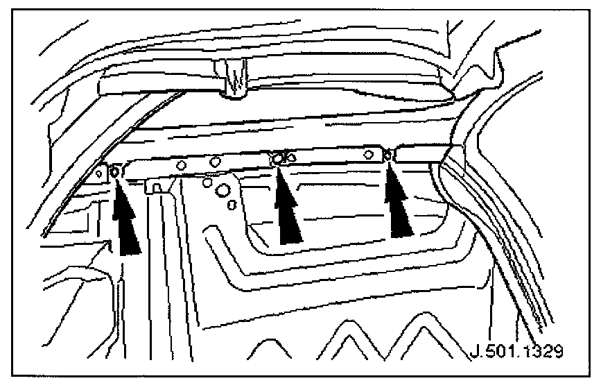 9. Slacken and remove headlining rear header rail clip securing nuts, remove clips and release tension cables.