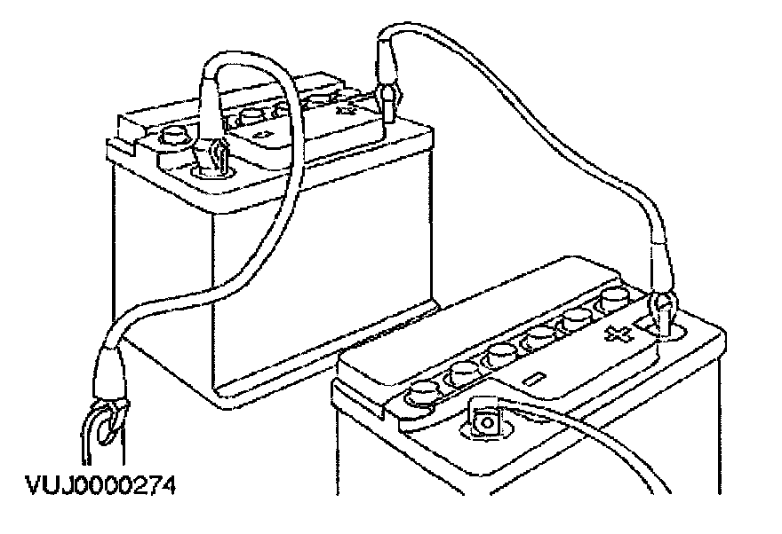 WARNING: MAKE SURE THAT THE ENDS OF THE JUMP LEADS DO NOT TOUCH EACH OTHER OR GROUND AGAINST THE VEHICLE BODY AT ANY TIME WHILE THE LEADS ARE ATTACHED TO THE BATTERY. A FULLY CHARGED BATTERY, IF SHORTED THROUGH JUMP LEADS, CAN DISCHARGE AT A RATE WELL ABOVE 1000 AMPS CAUSING VIOLENT ARCING AND VERY RAPID HEATING OF THE JUMP LEADS AND TERMINALS, AND CAN EVEN CAUSE THE BATTERY TO EXPLODE.