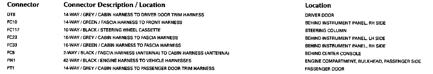 For detailed informations and illustrations regarding the location and identification of control modules pins, refer to Vehicle/Diagrams/Connector Views. Connector Views