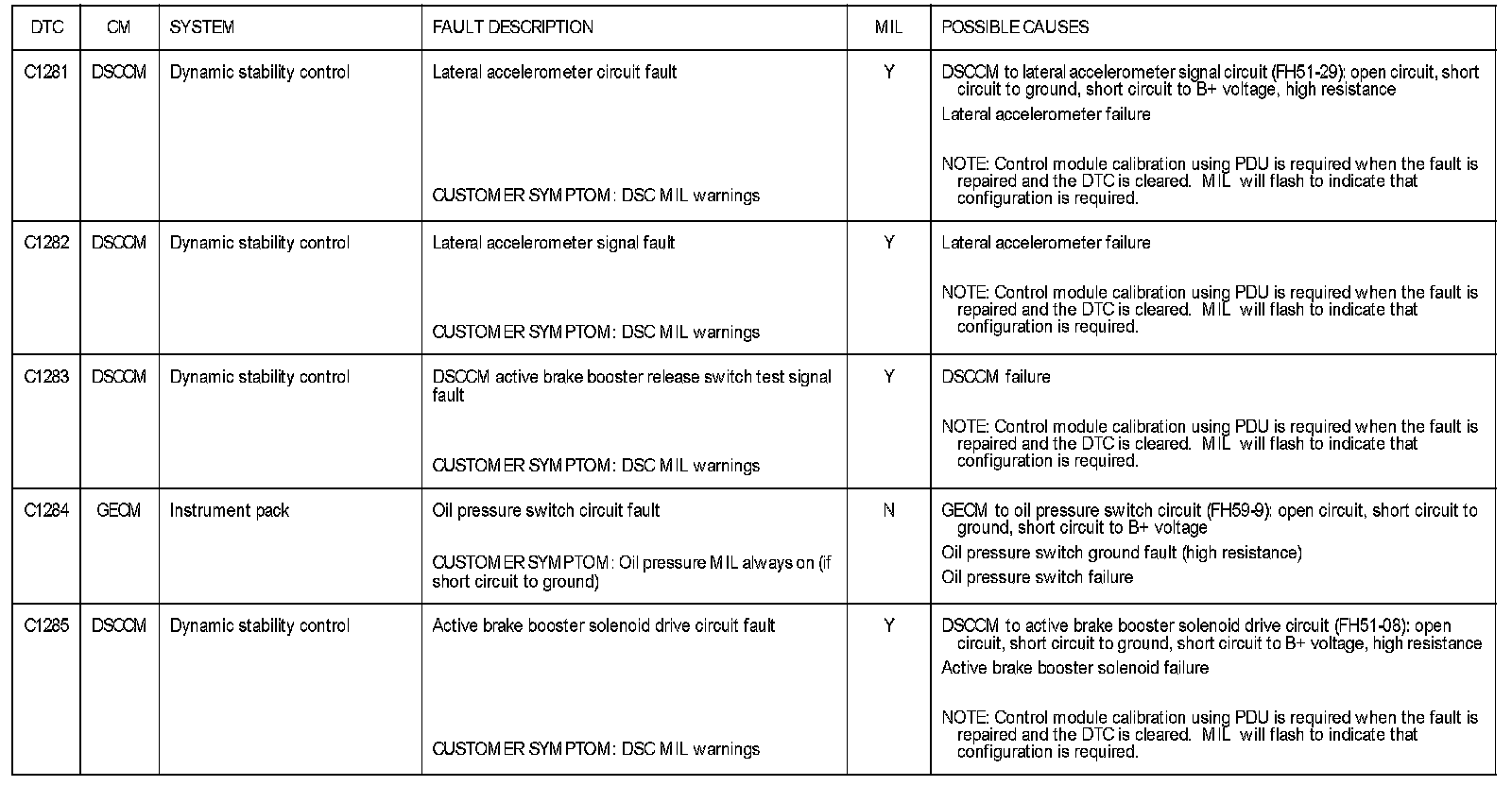 DTC C1281 - C1285: