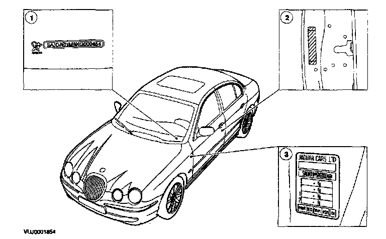 The official VIN for title and registration purposes is stamped on a metal plate and fastened to the instrument panel. It is positioned close on the left-hand side of the vehicle and is visible from the outside. The vehicle identification number is also located on the vehicle certification label and is also stamped into the RH shock absorber mounting panel in the trunk.