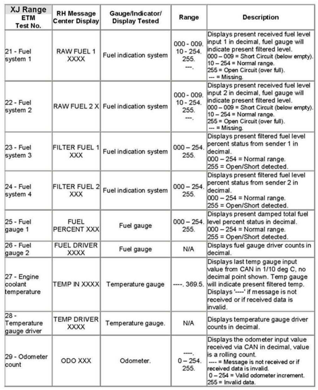 The Instrument Cluster (IC) installed from the start VINs listed above contains a self- diagnostic feature known as Engineering Test Mode or ETM. The ETM can display the status of IC inputs as well as providing a number of other useful features.