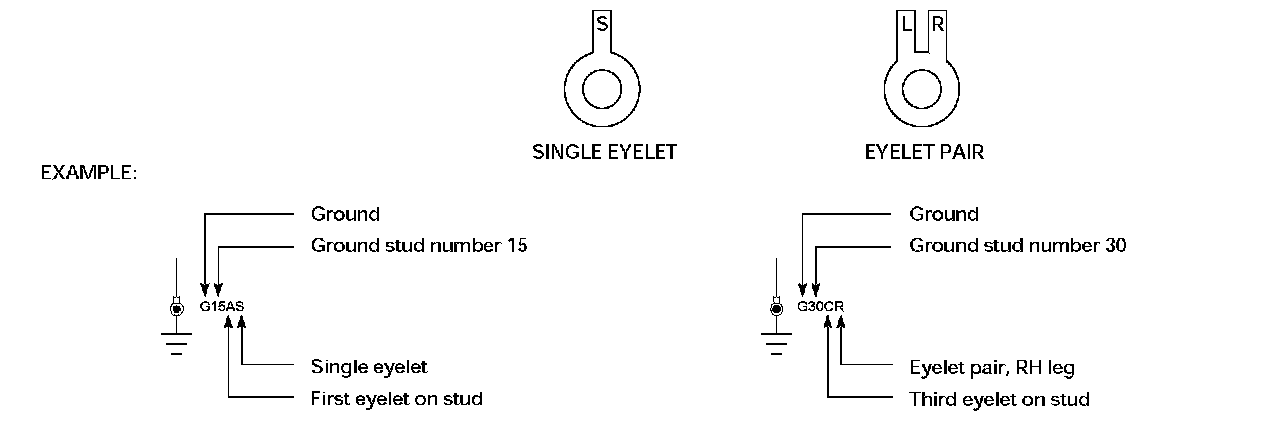 There may be up to three eyelets on one ground stud. A, B and C are used to indicate the position of the eyelet on the stud: A first (bottom), B second (middle), C third (top). Two eyelet variations are used: a single eyelet and an eyelet pair. The single eyelet has a single leg , which is identified by an S; the eyelet pair has two legs , identified as L (left) or R (right).