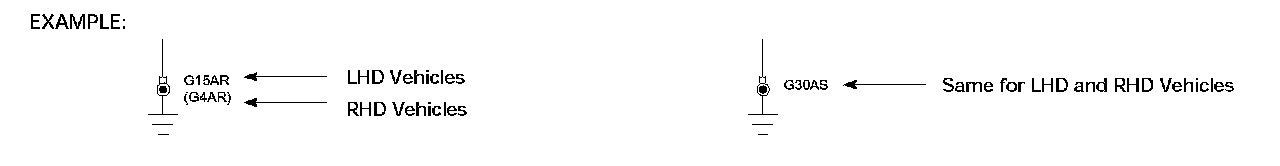 On figures where LHD and RHD circuits are combined and the ground designation differs from LHD to RHD, the RHD ground is shown in parentheses. If the ground designation is the same for LHD and RHD, only one ground designation is used.