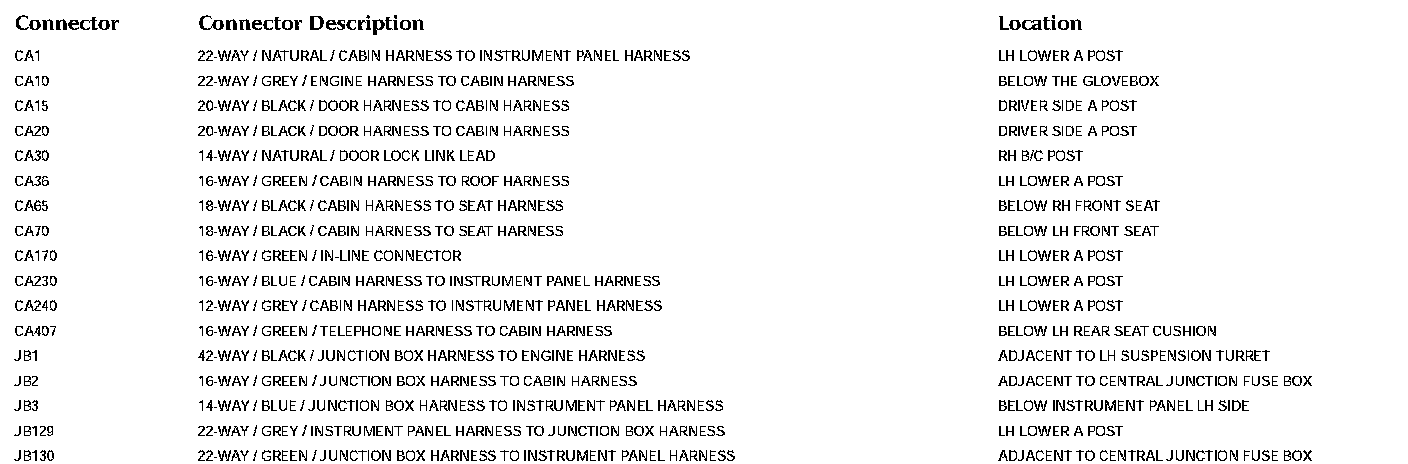 Refer to Vehicle / Locations for detailed information and illustrations regarding the location and identification of harnesses, relays, grounds and control modules. Locations