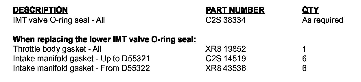 In case of a customer complaint of the above condition check whether the Intake Manifold Tuning (IMT) valve 0-ring seal has failed. If so, DO NOT replace the IMT valve since the 0-ring seal is now a serviceable item. Follow the workshop procedure outlined below.