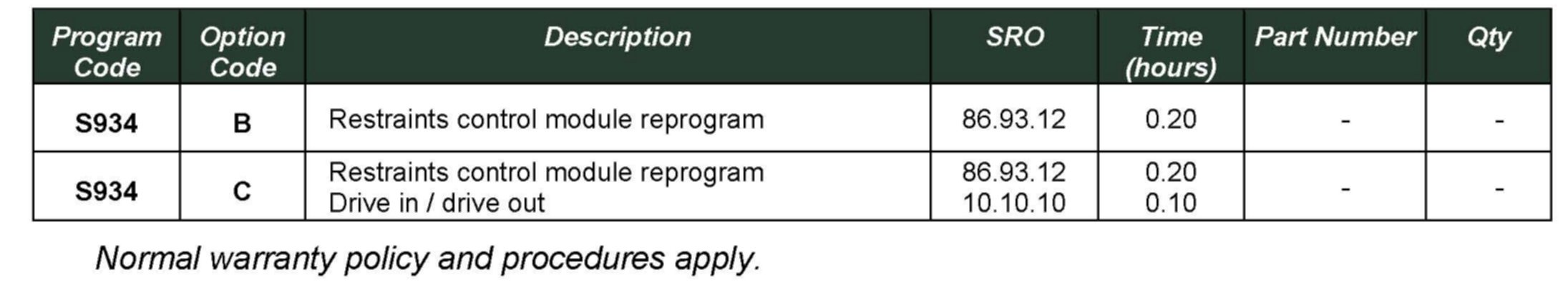 SERVICE ACTION S934: Change in Specification - Reprogram Adaptive Restraints Control Module