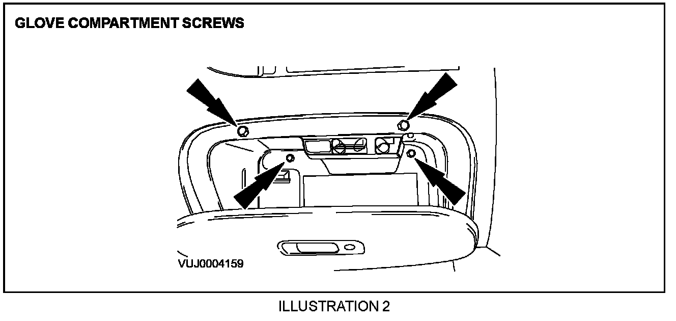 7. Remove the glove compartment retaining screws (Illustration 2).