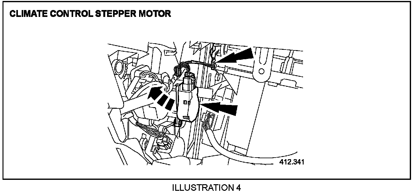 10. Disconnect the air inlet blend door actuator electrical connector, undo and remove the climate control upper front stepper motor securing screws and displace the climate control stepper motor and reposition to gain working access (Illustration 4).