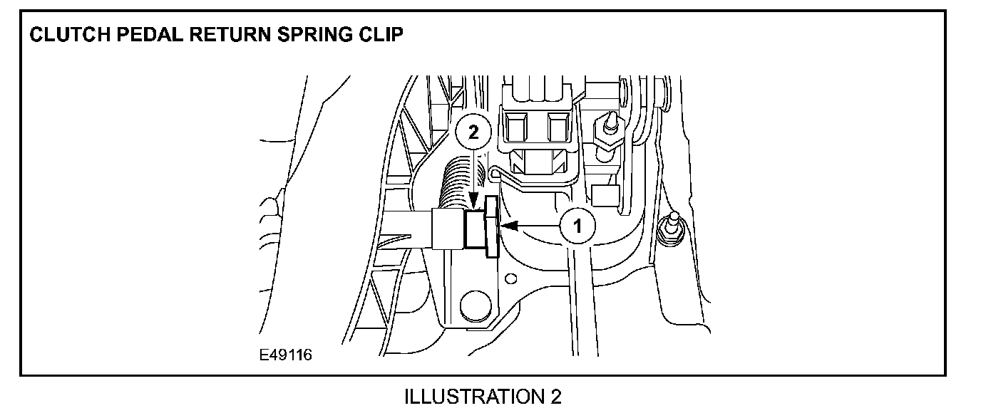 3. Manual vehicles only: Remove the clutch pedal return spring clip (Illustration 2).