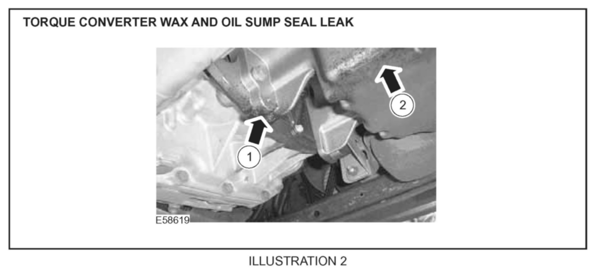 3. Refer to Illustration 2 for the difference in appearance between a torque converter wax (1) and a sump seal leak (2) collecting in the same location.