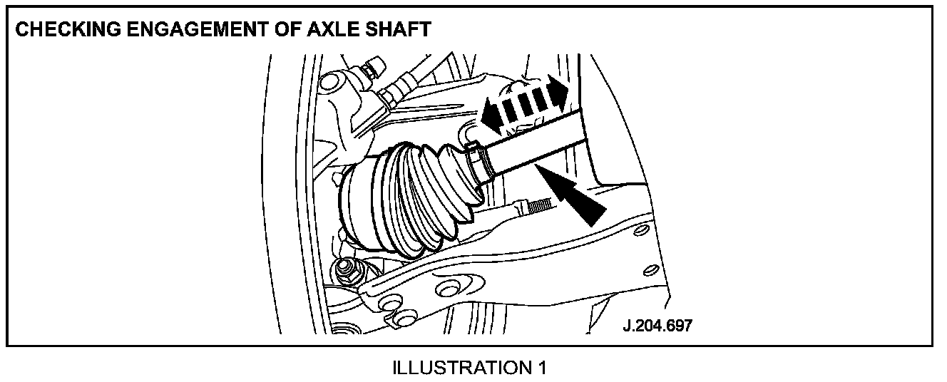 2. From under the vehicle grip the first front axle shaft. Push the front axle shaft towards the outer Constant Velocity (CV) joint then pull back the axle shaft towards the transmission (Illustration 1).