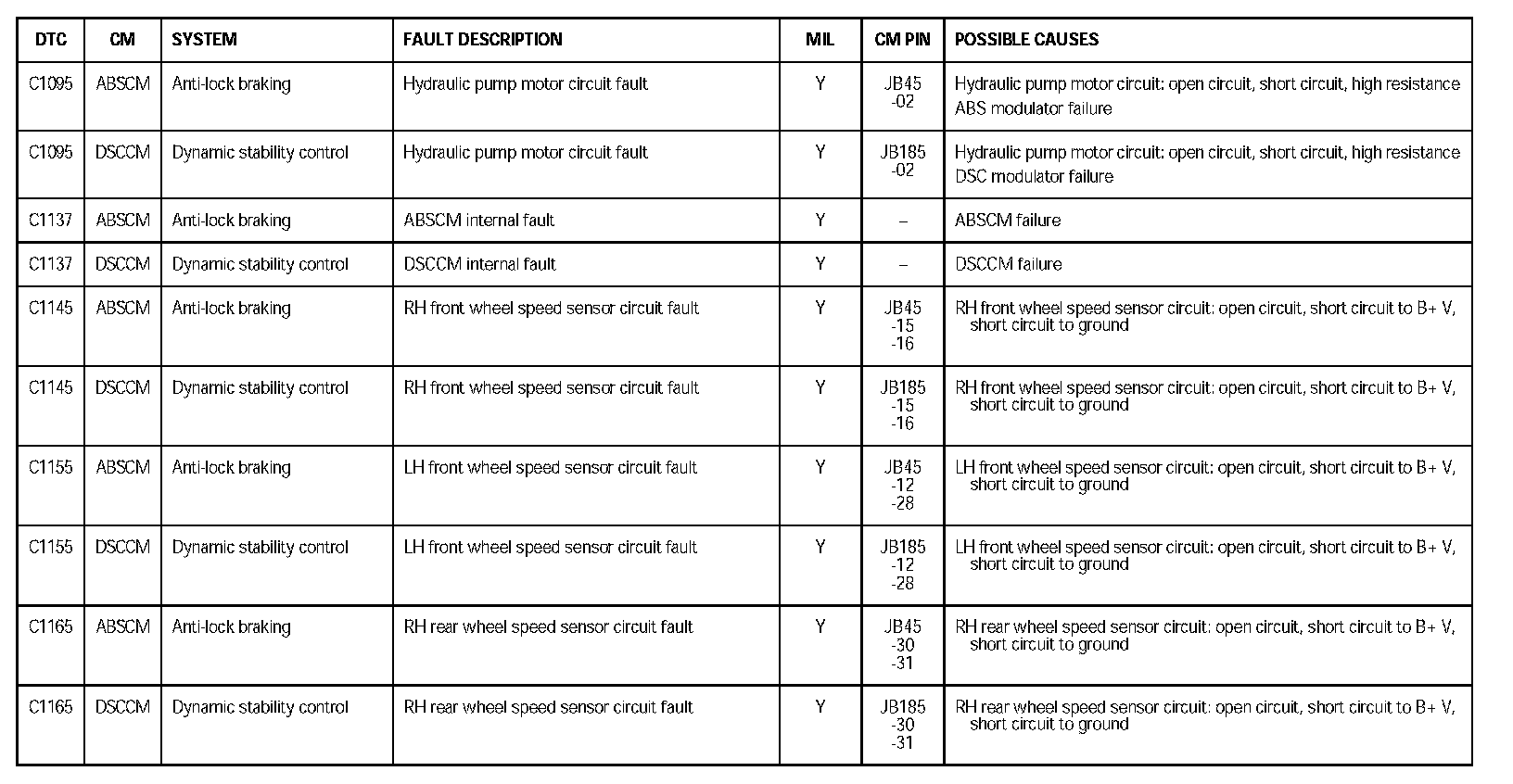 DTC C1095 - C1165: