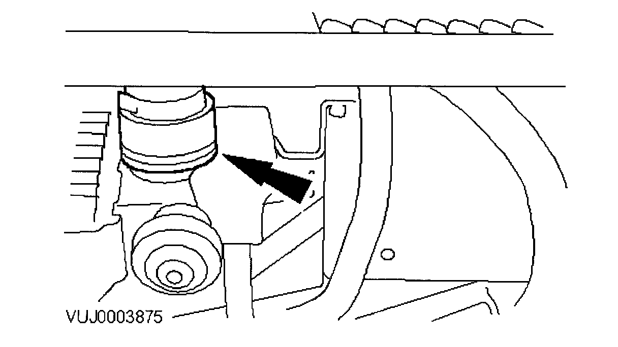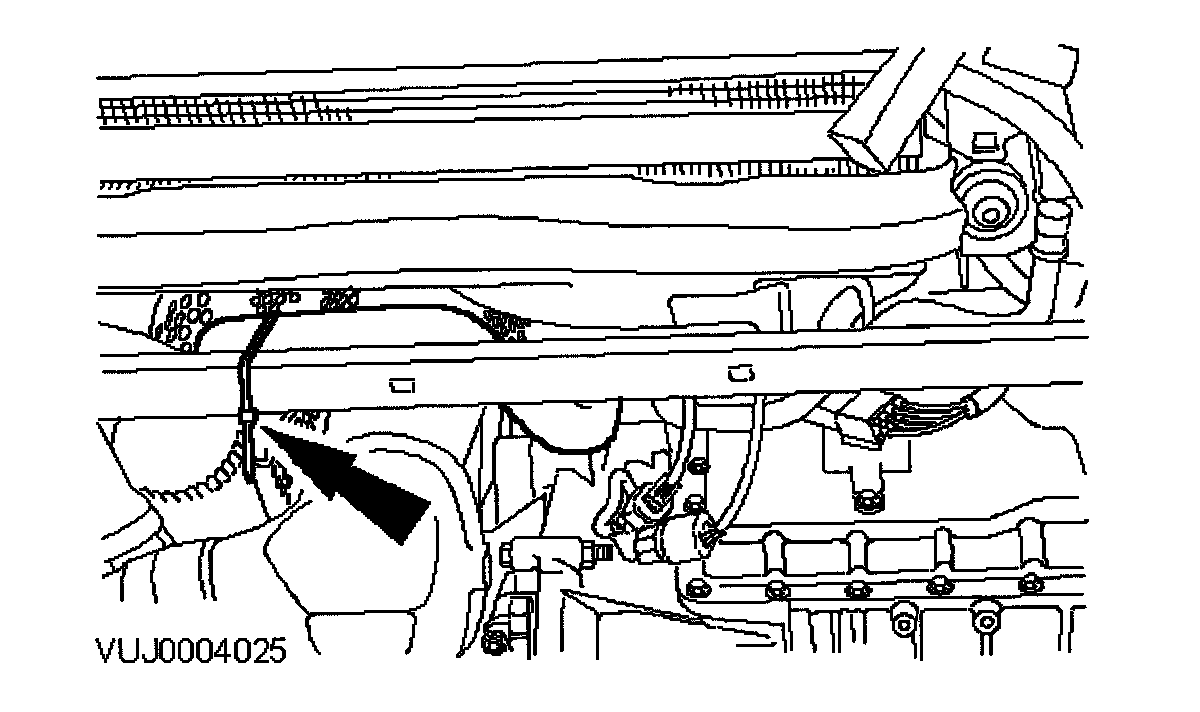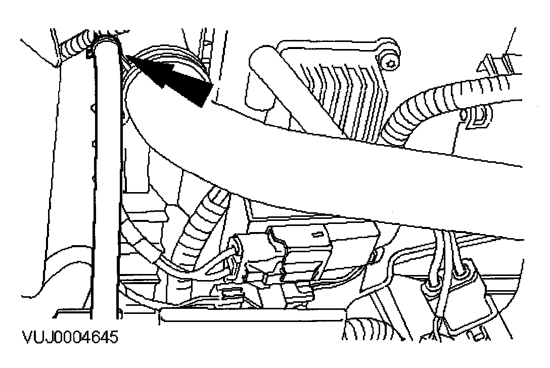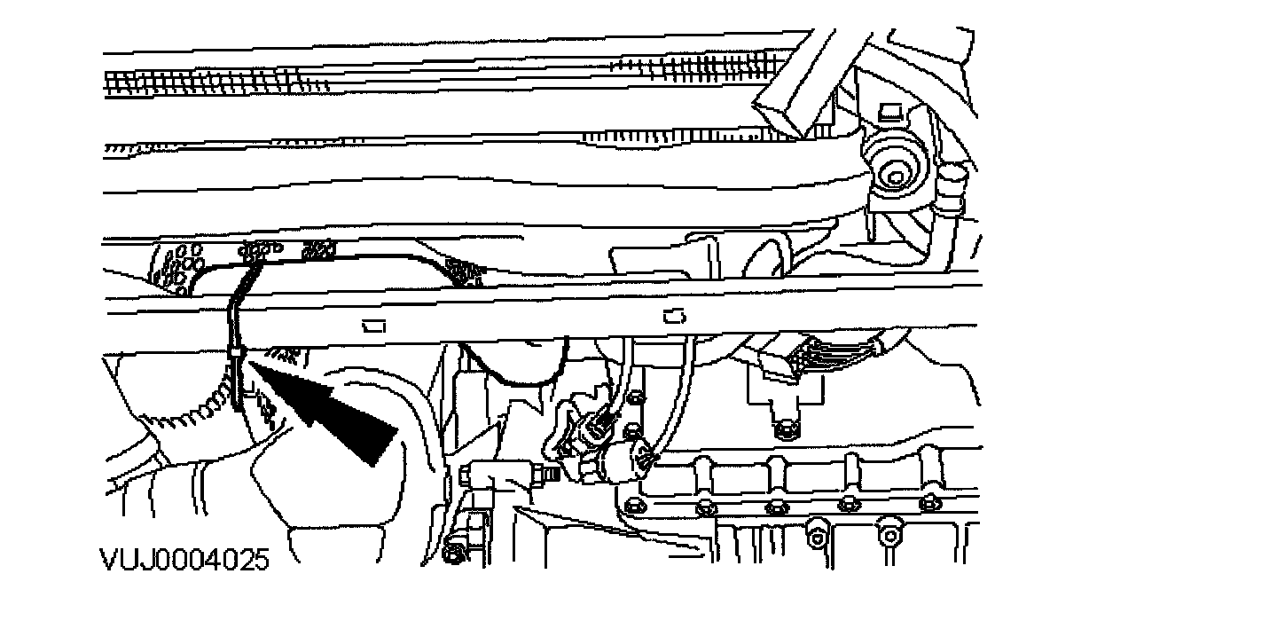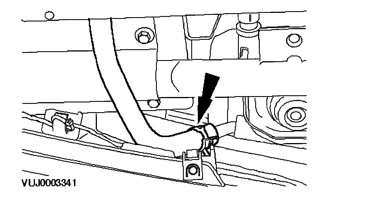 6. Reposition the coolant hose from the engine oil cooler to the thermostat housing and secure it to the front cross member using a suitable retaining strap.
