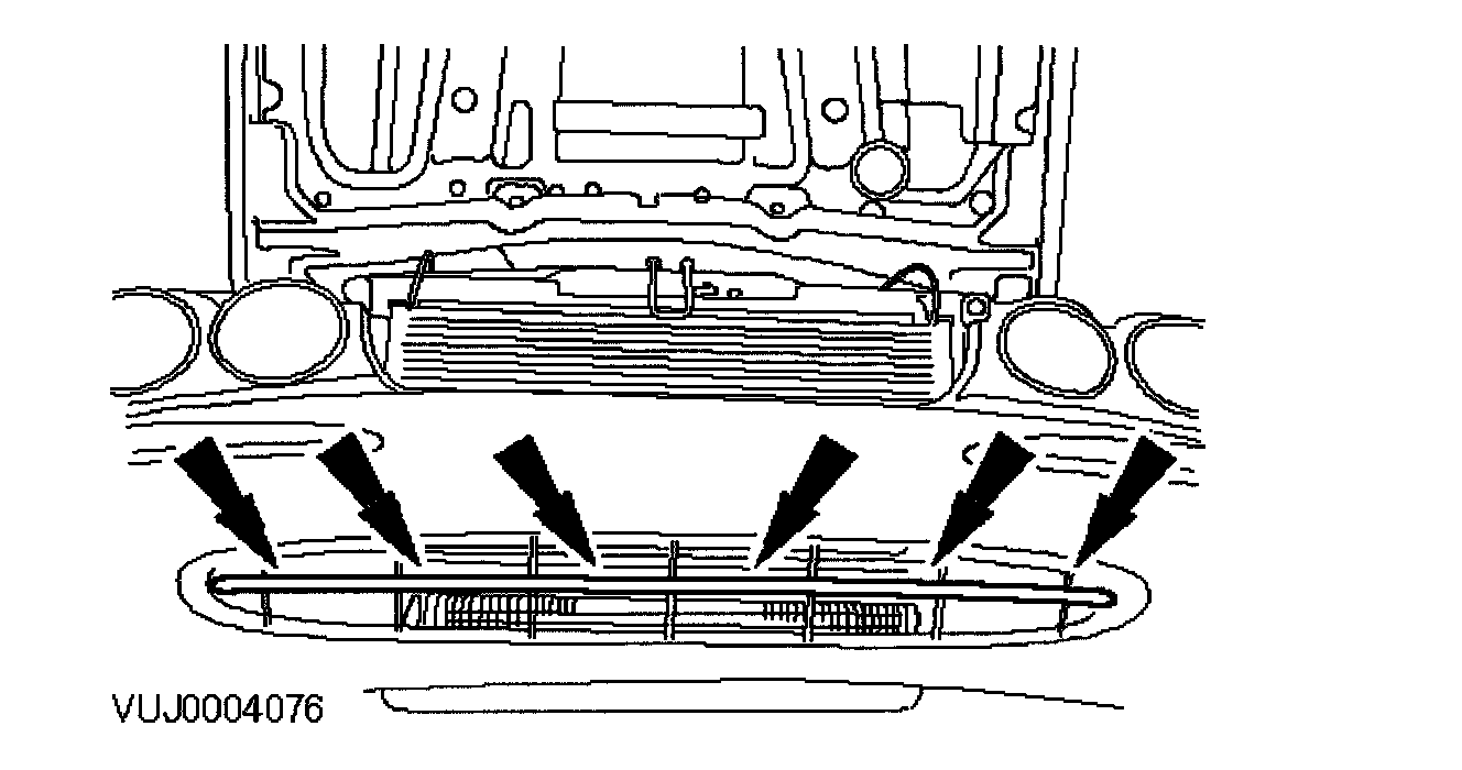 17. CAUTION: Apply suitable tape to the right hand side lower section of the front bumper to prevent damage to the paintwork from the air conditioning pipe when the cooling module is lowered. Failure to follow this procedure may cause damage to the vehicle.