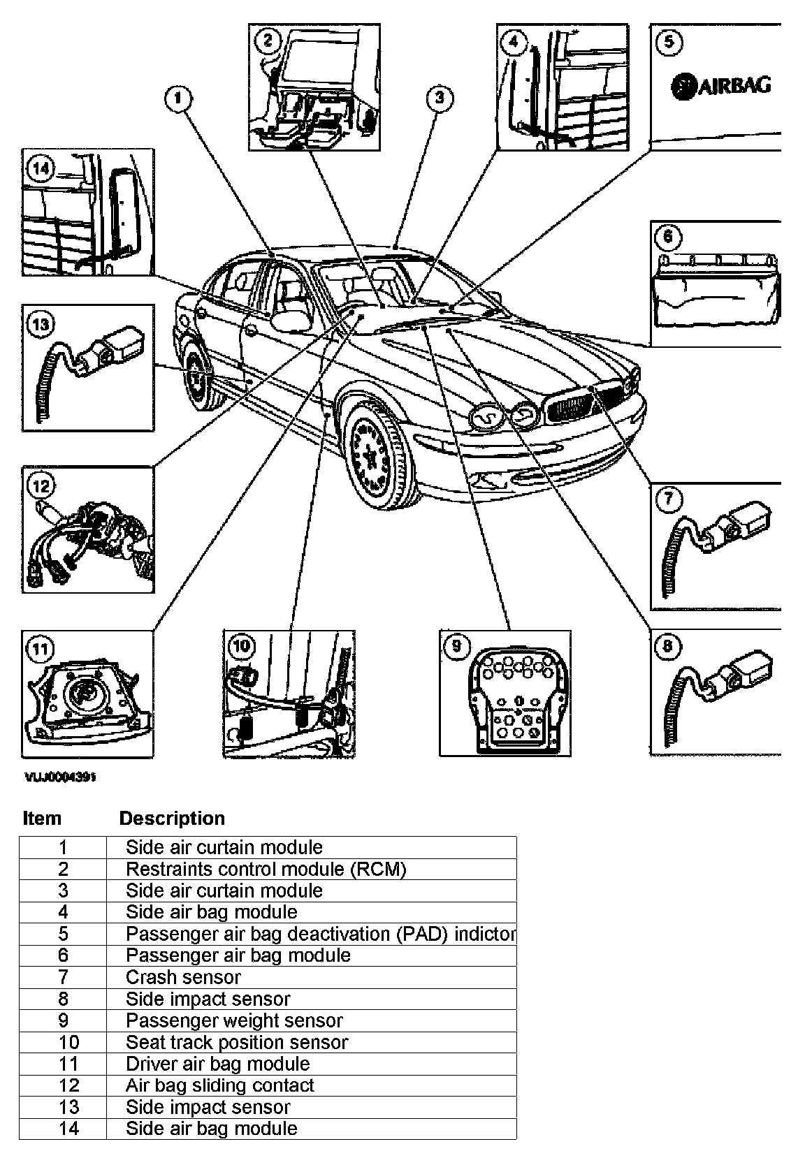 - The primary purpose of the restraints control system is to discriminate between an event that warrants supplemental restraints system deployment and an event that does not. The air bag control module, located under the floor console, governs the operation of the whole system and performs continual system diagnostics. Information on the severity of an impact is received from the crash sensor. In the event of a side impact, in excess of a predetermined limit, the air bag control module will evaluate the signal received from either of the side impact sensors against stored data and deploy the corresponding side air bag module and the side air curtain module. In the event of a frontal impact, in excess of a predetermined limit, the air bag control module will evaluate the signal received from the front crash sensor against stored data and deploy the front air bag modules and the safety belt buckle pretensioners. Variations in the deployment of the front air bag modules are dependent on the status of the driver seat track position, passenger weight sensor and the front safety belt buckles.