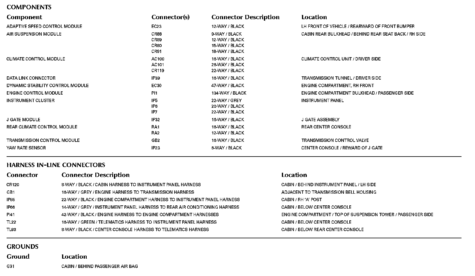 Locations: The location views for Ground Points, In-Line Harness Connectors, Harnesses, and Control Modules depicted within these diagrams can be found at Vehicle/Locations. Locations