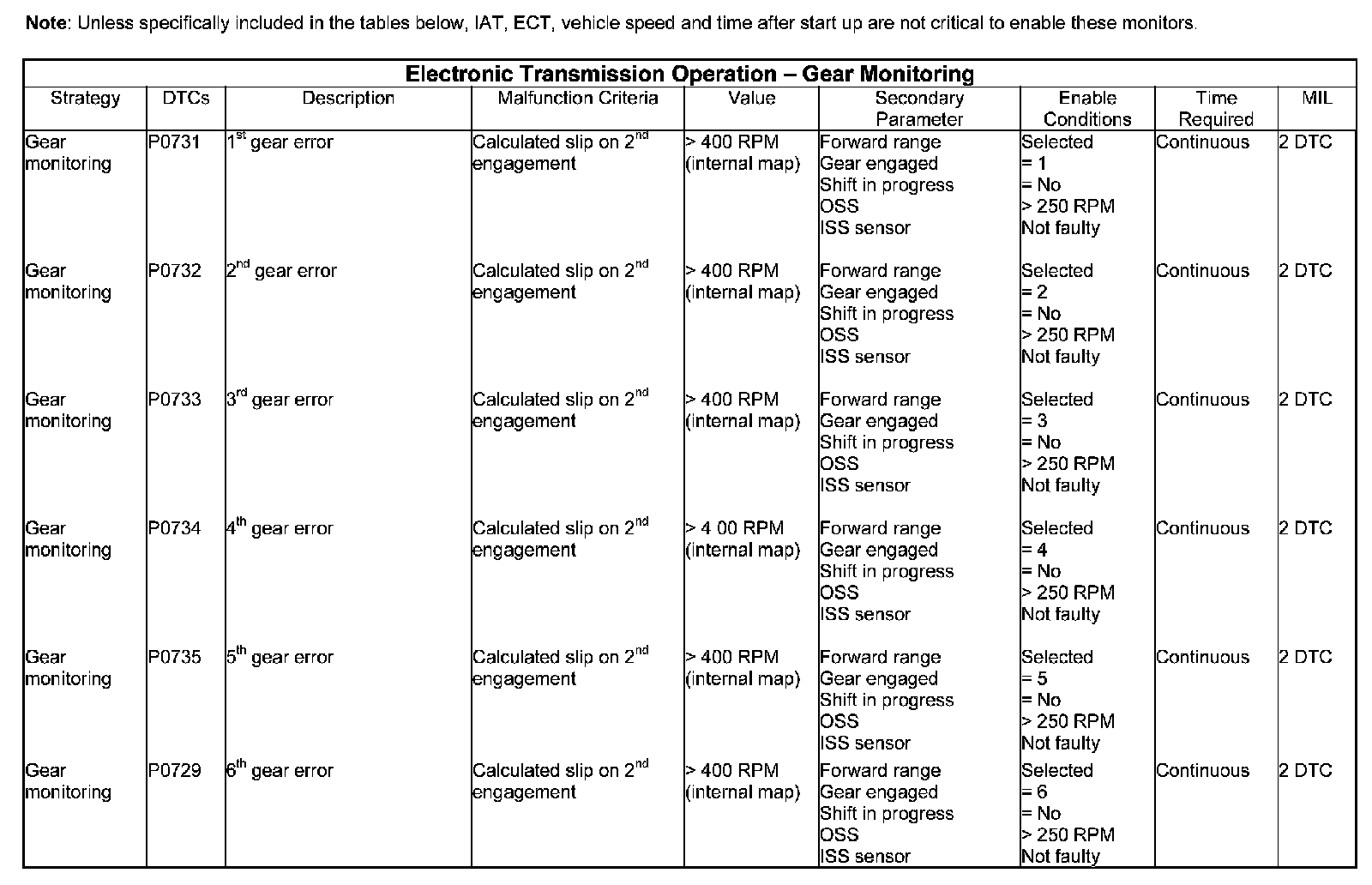 The objective behind gear monitoring is to detect non-electrical errors that are caused by slipping clutches or by the mechanical failure of actuators. When outside shift functions, verification checks are conducted for the OSS in relation to the ISS. Failure results in a default gear being selected by the TCM.