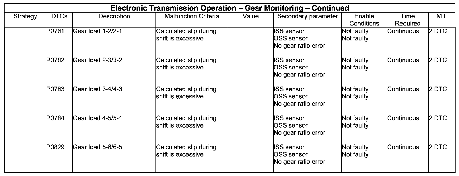 These monitors identify excessive or reduced slip during gear changes. The excessive slip part of the monitors is caused by the engaging clutch not coming on quickly enough. The reduced slip monitoring identifies that the off going clutch is not coming off quickly enough. These monitors run continuously as long as the entry conditions continue to be satisfied.