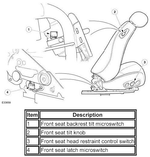 NOTE: The front seat head restraint will lower in the event that the seat backrest tilt microswitch fails. In this condition, the front seat head restraint will not work until the front seat is tilted forward, responding to the front seat latch microswitch changing state.