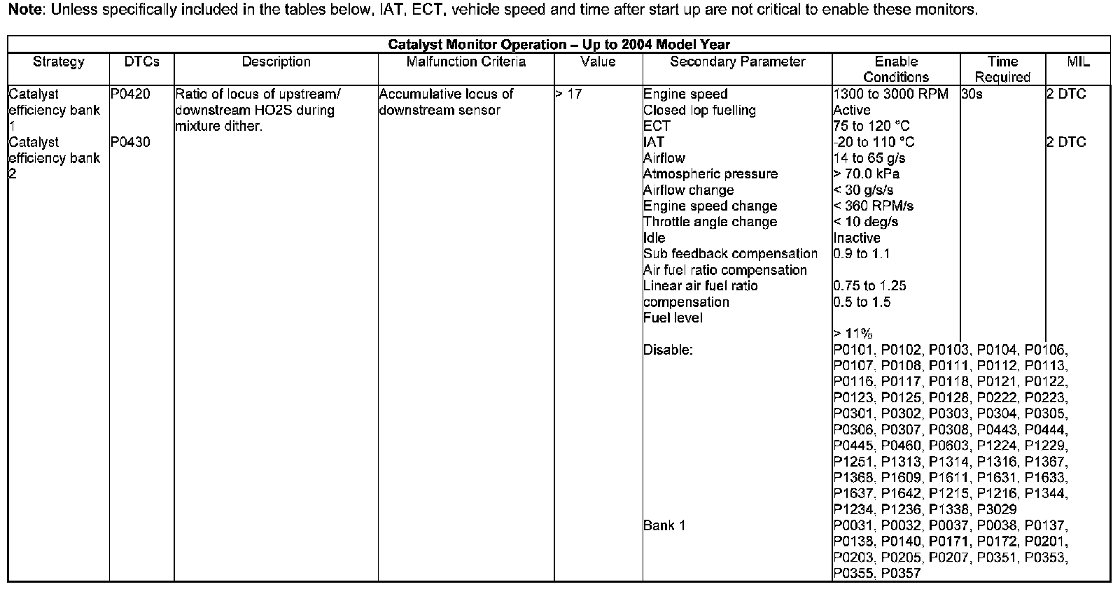The Catalyst monitor operates once per trip, and is not a continuous monitor. The monitor waits until all entry conditions are met, including the modeled catalyst temperature reaching its threshold. Once all entry conditions are met, the monitor starts to run. The fuelling is cycled rich and lean (called dither) by approximately 3% to get a reaction at the downstream Oxygen Sensor (O2S). At the start of the monitor, delay counters operate so that the fuelling is stable when the diagnosis takes place. If the entry conditions then drop out, the monitor result and execution timer are held at the values that they were when the entry conditions dropped out. The next time entry conditions are met the monitor carries on from where it stopped previously. This will happen for a maximum of four attempts, after this, the monitor will reset and the diagnosis restarts.