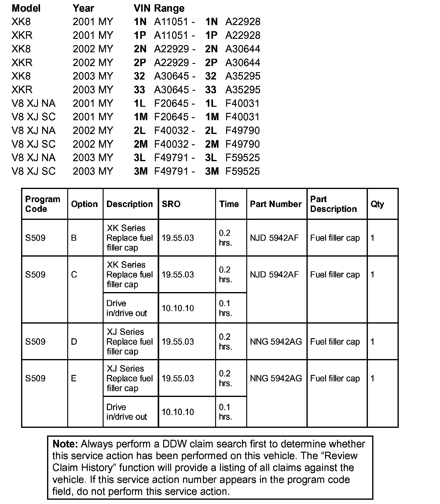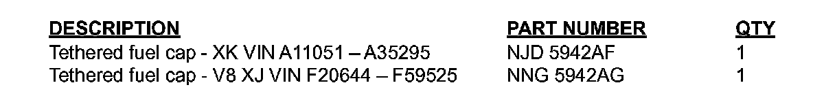 Install a revised fuel filler cap of all 2001-03 MY V8 XJ Series and XK vehicles within the above VIN ranges after verifying that the service action has not been completed on the vehicle in question.