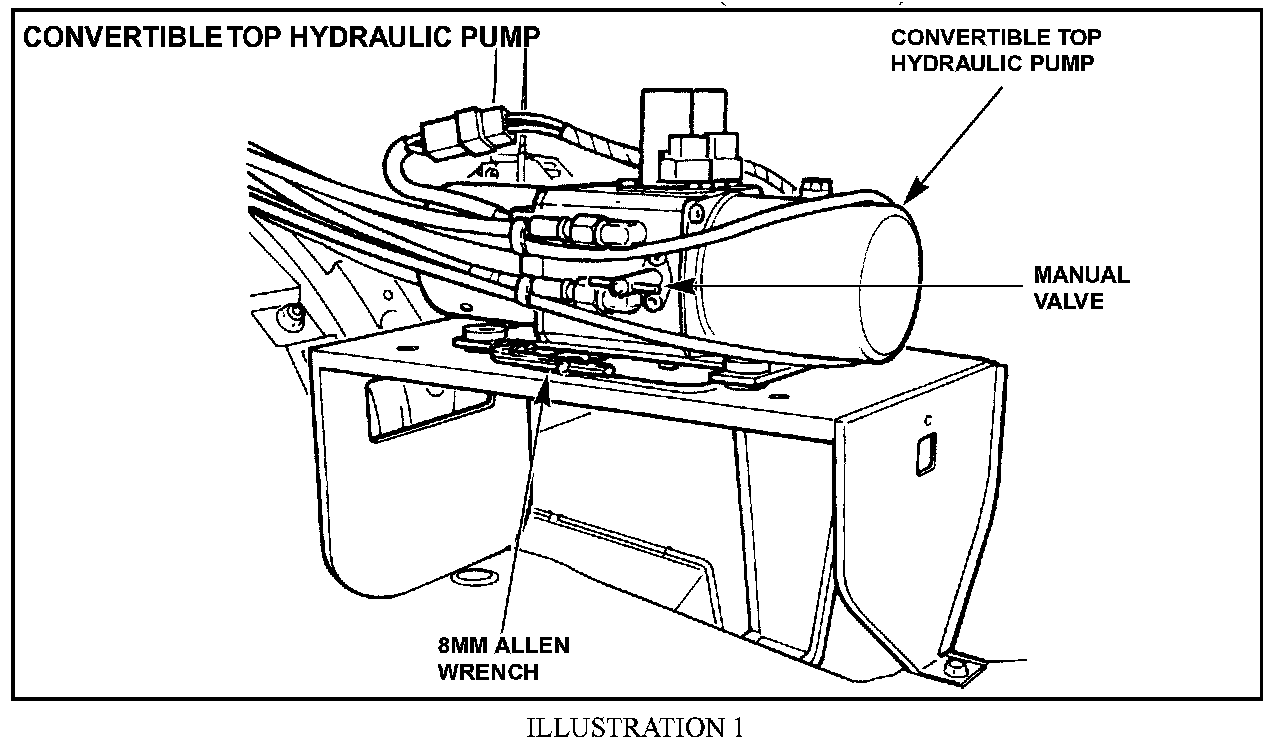 1. Remove the right side trim panel in the trunk to gain access to the soft top hydraulic pump (Illustration 1).