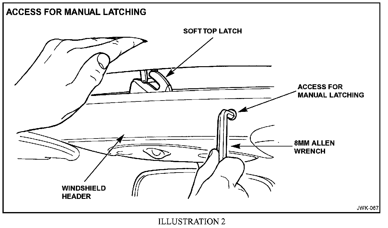 This bulletin details the proper procedure for raising the convertible soft top manually in case the power operation does not work. Damage to the mechanism will occur if the procedure detailed below is not followed.