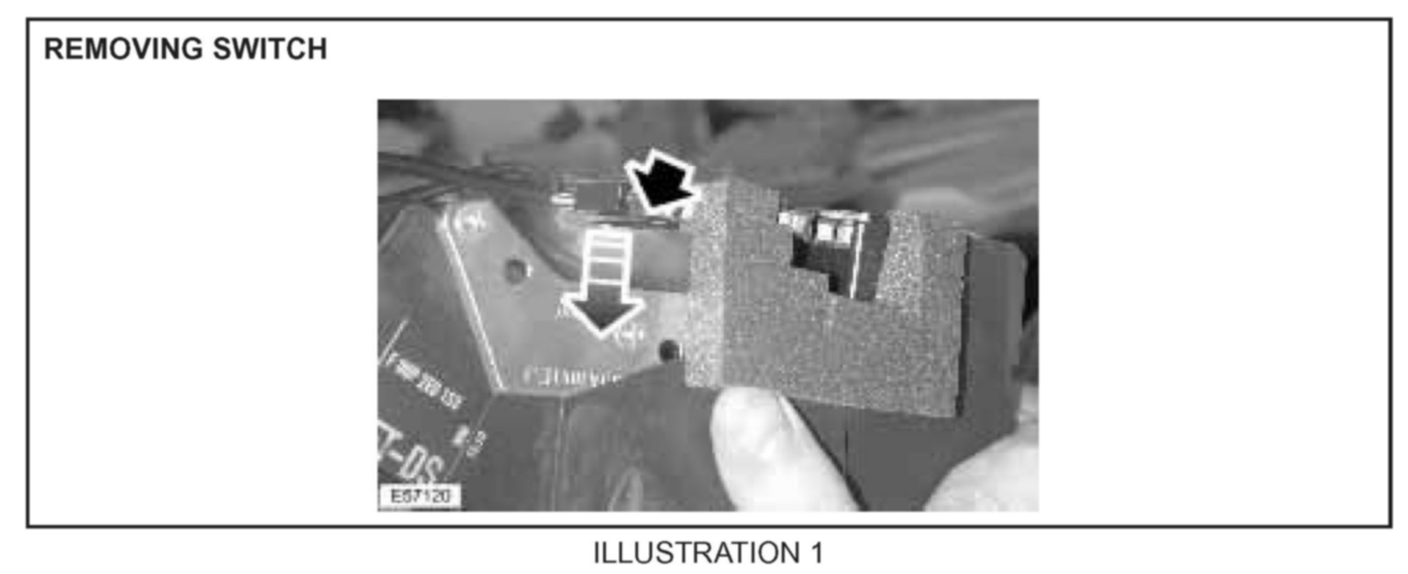 5. Press the retaining tang and remove the switch from the door latch (Illustration 1). Note orientation of the switch in the door latch for assembly purposes.