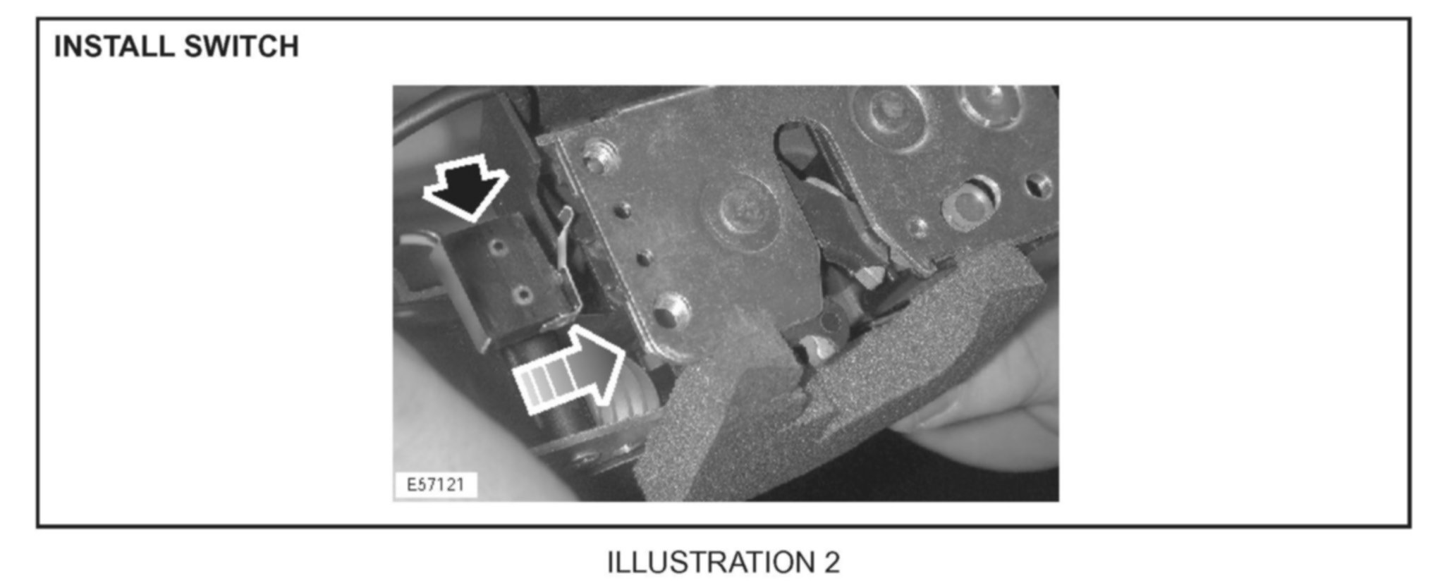 6. Install and seat the new switch to the door latch. Ensure that the switch is installed in the correct orientation and that the locating pegs are engaged (Illustration 2).