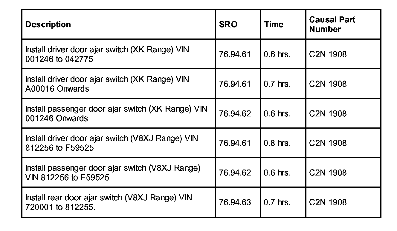 If fault has been identified with the door ajar switch on vehicles within the above VIN range, it is no longer necessary to replace the latch assembly. The door ajar switch is now a serviceable item.